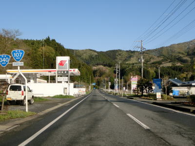 | 住田町の中心部の手前でR107・R397世田米交差点に至る。案内標識にR340のおにぎりは表記されていないが、左折してR107との重複区間を北上・遠野方面に進む。同じく案内標識に表記されていないR397はR107の両方面に重複しており、世田米交差点から西は3国道重複区間である。 世田米交差点の直後に瀬音橋で気仙川を渡る。町の中心部を通り抜けていた旧道に対して少し離れた山裾を通っており、沿線には家屋よりも商業施設が多い。100番台国道と重複しているが、早朝だと交通量は少ない。 |