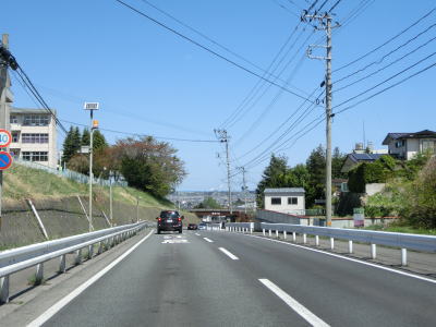 | 沿線の建物が増えてきた状態を走っていると青森r29交差点を通過する。r29は八戸環状線という路線名からも想像できる通り、片側2車線と整備された幹線道路である。その先から下り勾配となるが、前方に八戸市の市街地が見えてくる。市街地に差し掛かると勾配が緩やかになる。 | ||