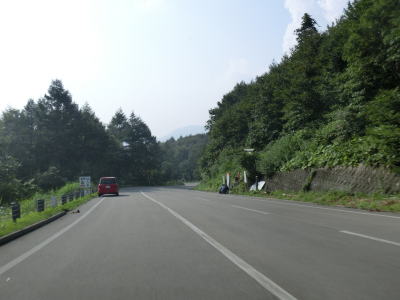 | 源流に近い赤川の北を西進していると反対車線に登坂車線が現れる。勾配は8%と先ほどの10%に比べると緩やかである。登坂車線区間の西端に近い場所には仙人水と呼ばれる湧水がある。通過時は1台1組の夫婦しかいなかったが、混雑している時は順番待ちの列ができるらしいが、駐車スペースは設けられていない。仙人水から程なくして登坂車線がなくなり対面2車線となり、急カーブが連続するようになる。見通しはあまり良くないが狭路ではないので特に走りにくい訳ではない。 | ||
