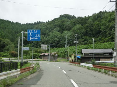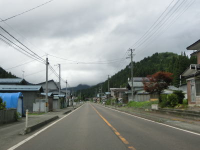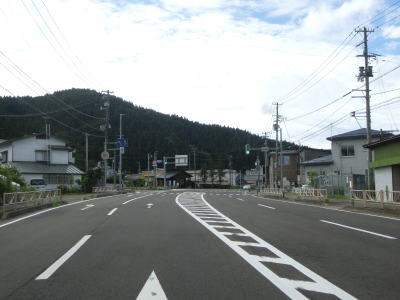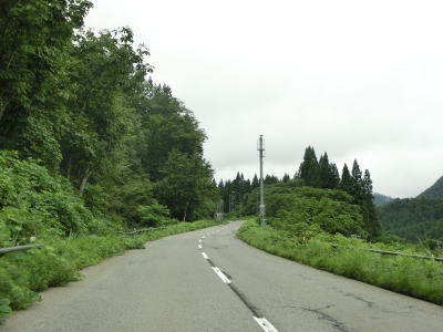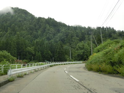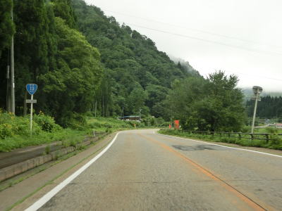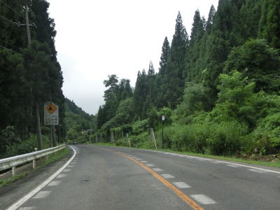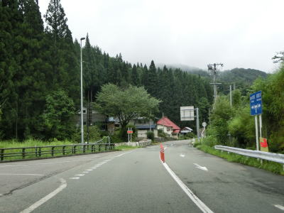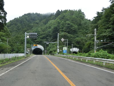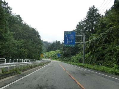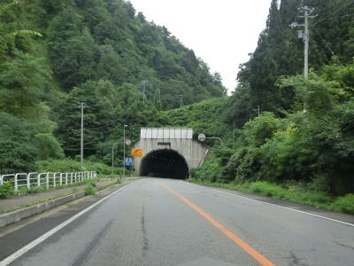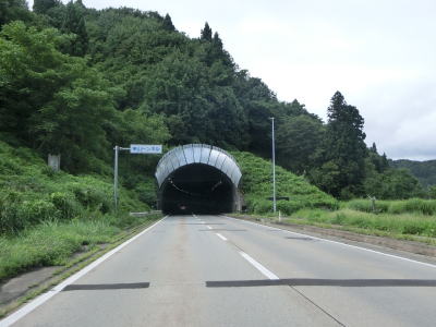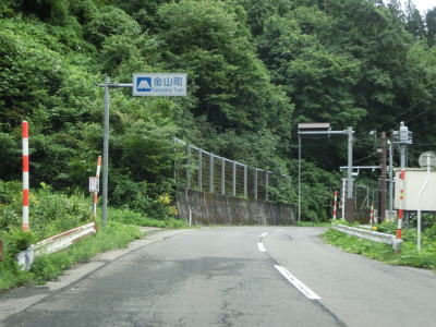 | 雨量通行規制区間に入ってしばらくは急カーブが連続しているが、二桁国道との重複区間とあってセンターライン付きの2車線道路と整備状況は悪くない。カーブが落ち着いた後に主寝坂隧道をくぐって金山町に入る。トンネル内は若干狭くセンターラインが引かれておらず、3.6mの制限高が設定されている。主寝坂道路が開通する以前は交通量も多く、大型トラック同士が離合できないためトンネル手前で対向車を待つために小規模な渋滞が発生する事もあったようだ。 | ||