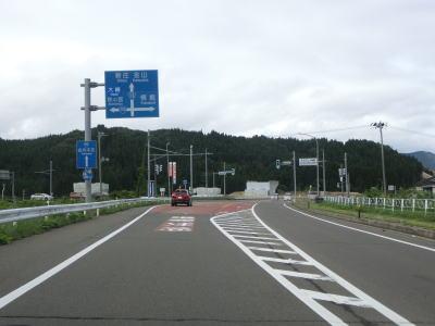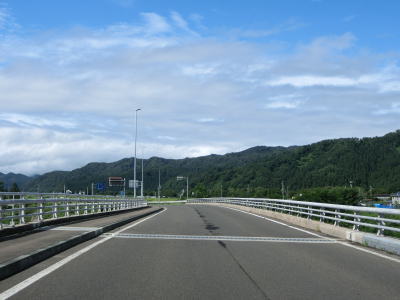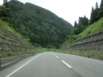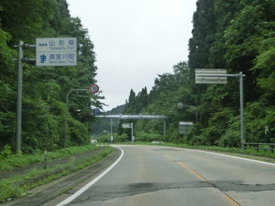 | 真室川ICの直後に左にカーブしてから緩やかな右カーブを曲がる。真室川に架かる塩根橋を渡るまで下り、山形r35交差点から上り勾配となる。r35交差点のすぐ先に閉鎖用ゲートが設置されており、連続雨量が150mmを超えると通行止になる雨量通行規制区間である。 | ||
