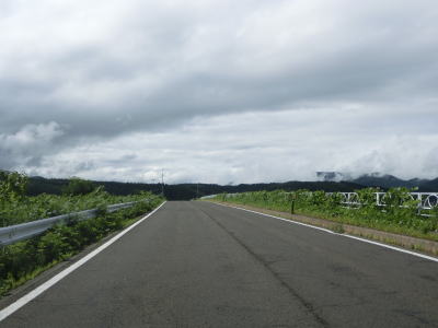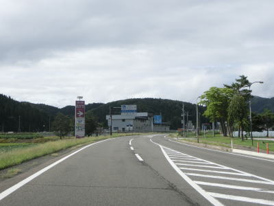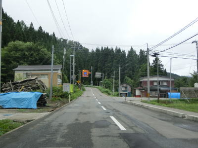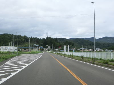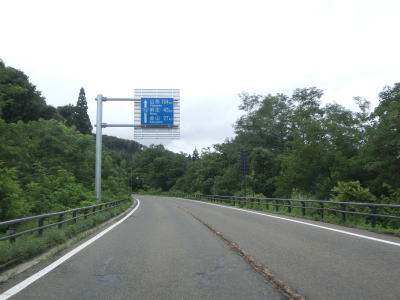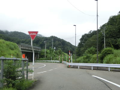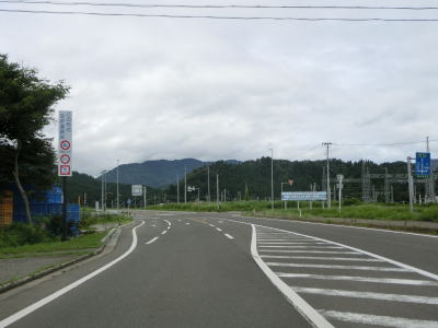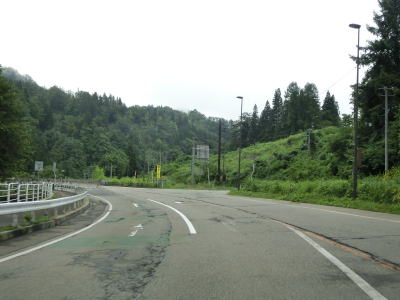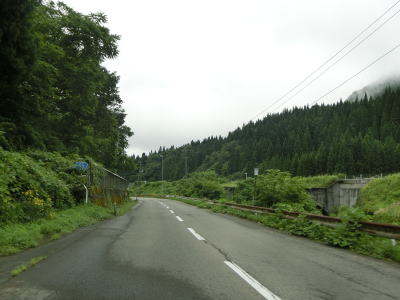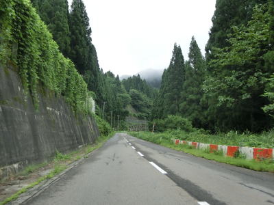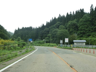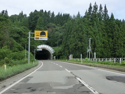 | 雄勝トンネルを出てからもコンクリート舗装が続いている。朴木沢川の流域を下っていると及位駅の南東で旧道との交差点を通過する。その反対側に結構な広さの駐車帯があるが出入口にラバーポールが設置されて進入できなくなっていた。一時的な閉鎖でないにもかかわらず、手前の「P」標識は撤去も覆いもされていない。この駐車帯の前で舗装がアスファルトに変わる。そのまま2車線道路を走ると及位トンネルをくぐる。 | ||
