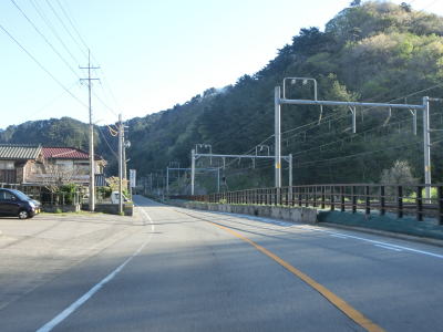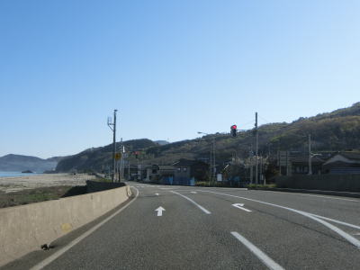 | 今川に架かる新今川橋を渡って旧道と合流した後に左カーブを曲がって根込隧道と宝谷隧道を相次いでくぐる。それらを出た後はホーヤ浜海水浴場という比較的長い距離の砂浜の横を通る。 | ||