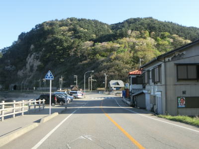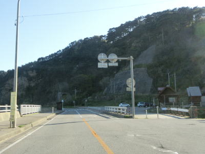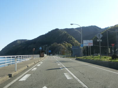 | 砂浜が終わると蓬莱第二隧道と第一隧道をくぐるが、第一隧道は切通しでもよいように見える。ちなみに、第一隧道に接している岩礁が蓬莱山で、標高は88mである。第一隧道からは下り勾配となるが、その後上り勾配となって脇川大橋を渡る。橋の下は海(脇川港)である。 | ||