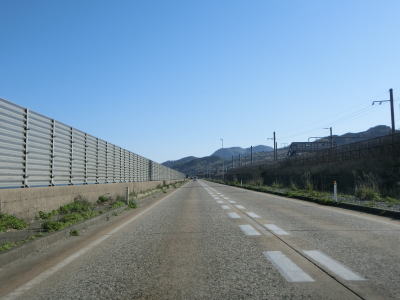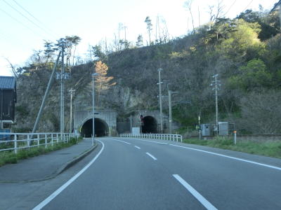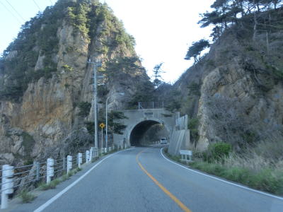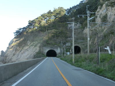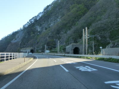 | 132.鉄道のロックシェッドが道路に転用されている | 133.北向き車線はロックシェッドの外側にある | 134.前方に見えるのは2つともJR羽越本線のトンネル |