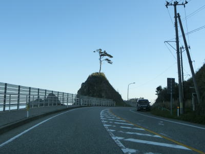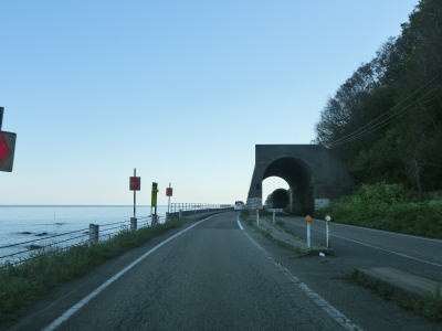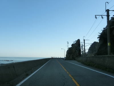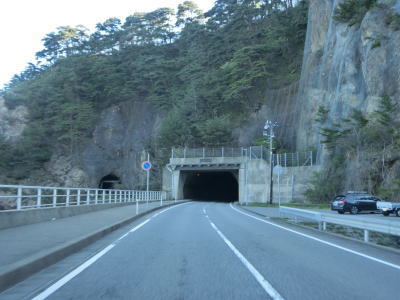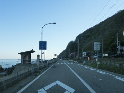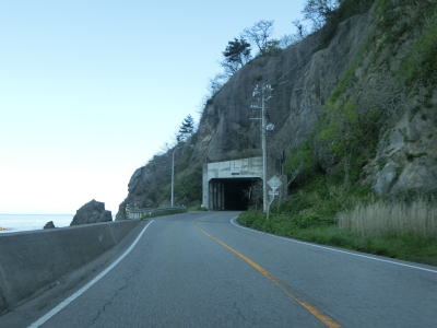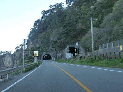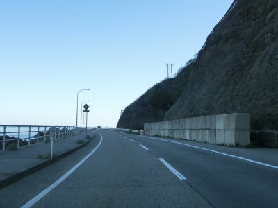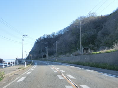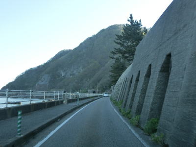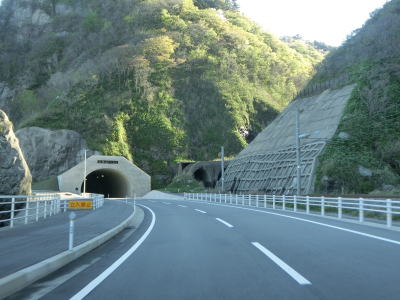 | サワジリ沢を渡った先で中央分離帯が現れ、南側向きの車線のみ長短2つのロックシェッドの海側を走る。その断面からも想像できるが、JR羽越本線のものが転用されており、線路は少し内陸をトンネルで抜けている。ロックシェッド区間を過ぎると普通の対面2車線道路に戻る。前方に2つのトンネル(厳密に言うとトンネルの坑口に接続するロックシェッド)が見えるが、どちらも羽越本線のものである。ここから勝木駅までは新勝木トンネルの上り線と海寄りのトンネルの多い下り線とが離れている。 | ||
