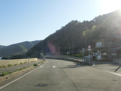 | 神宮沢第一隧道を出た直後に板貝集落を通る。板貝川に架かる橋付近までが大型貨物車等通行禁止区間である。起終点ともに市道が交差しているが、どちらの市道も川沿いに少し内陸に入った所までしか道路がないため迂回路としては利用できない。そのため、規制対象車両でここまで来てしまった場合は引き返すしかない。 板貝集落を過ぎると弘法トンネルをくぐる。海寄りの西側には旧道と思われる素掘りのトンネルが見える。弘法トンネルを出ると今川集落を通り抜けるが、東側に今川駅がある。 |