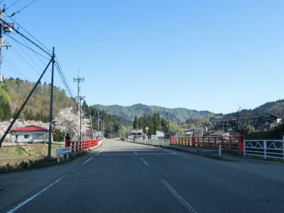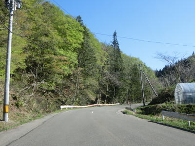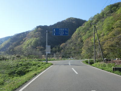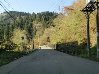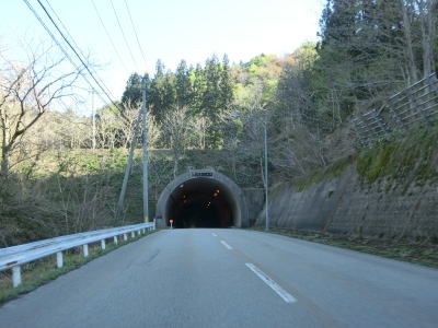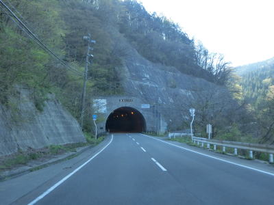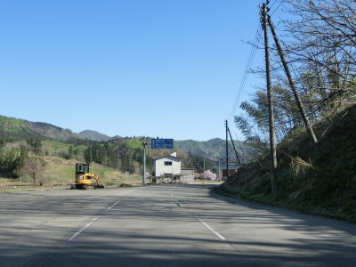 | やや急な左カーブを曲がりながら関川峠を越える旧道との交差点を通過する。その後、緩やかな右カーブを曲がるが、前回走行時(2011年5月)は法面崩落のため通行止であった。崩落の要因は東日本大震災の揺れであった模様。崩落復旧現場を過ぎてすぐに関川トンネルをくぐる。トンネルの上を横切る道路が見えるが、これが旧道である。供用が1989年頃なので30年ほど経過しているため、旧道の通行可否は不明だが、出入口が封鎖されている様子はなかった。 関川トンネルからは下り勾配となる。トンネルの南側に比べると日当たりが良くないようで道路脇に残雪が見られた。残雪の量は前回の方が遥かに多かった。中田橋と獺寝沢橋を相次いで渡った後に越沢集落に差し掛かる。 |