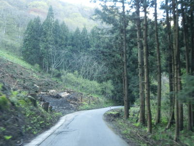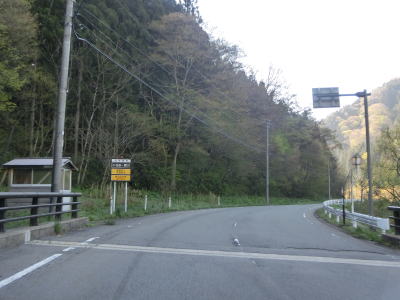 | 左カーブを曲がっていると市道(林道?)との交差点を通過するが、以降は南側の視界が開けている。緩やかな下り勾配の左カーブを曲がった先でセンターラインがなくなり道幅が狭くなる。とは言うものの平沢集落直後に比べると若干広く、1.8車線幅程度は確保されている。ただし、落石があるので楽に走れるような状況とは言い難い。 | ||