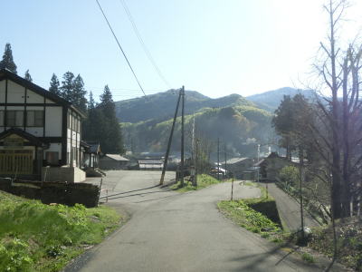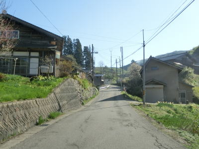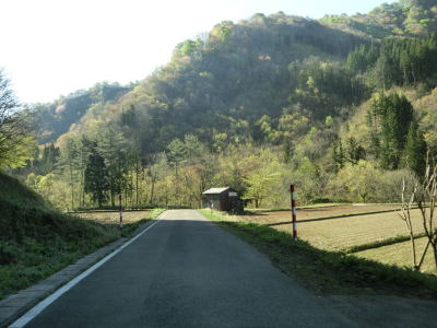 | おそらく関川集落のものと思われる水田が現れてからも1.0〜1.5車線幅の狭路が続く。南側に鼠ヶ関川があるため比較的日当たりの良い場所もあるが、左岸の斜面は日光が当たりにくいためゴールデンウィークであっても残雪が見られた。 | ||