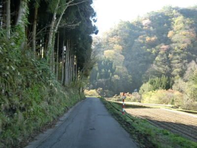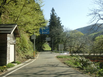 | 平沢集落の東の端の旧道との交差点の直後にセンターラインがなくなり道幅も狭くなる。鍋倉橋の東詰の道路情報板にあった幅2.0m超の車両の通行禁止区間はここから東である。大雨の際もここから東の区間が通行止になるが、道路情報板はあるもののゲートは設置されていない。 道幅が狭くなってからは沿線に家屋はないが、しばらくは田畑が存在している。田畑もなくなると杉林の中の若干薄暗い狭路を走る。なお、筆者のカーナビ(地図データは2018年版)では平沢集落から東に4km程の区間は道路を示す線が表示されなかった。 |