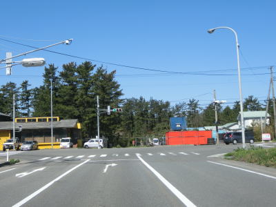 | 下り勾配が終わって平坦になった所でR7菅里交差点に突き当たる。R345の終点は遊佐町にあり、かつ一桁国道との交差点ではあるが、この交差点は終点ではない。右折してR7との重複区間を秋田・由利本荘方面に進む。 菅里交差点から300m弱で道の駅「鳥海」を通過する。R7に接する道の駅とあって行楽シーズンは混雑している事も多い。出入口に信号機が設置されておらず、また交通量も多いため、右折で入るのはともかく出るのはタイミングが悪ければ中々出られない事もある。 道の駅を過ぎると緩やかな右カーブとなるが、R345は西浜交差点を左折してR7から分岐する。重複区間の距離は600m弱と短い。案内標識の地名からも分かるとおり、ここからは海沿い区間になる。 |