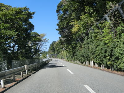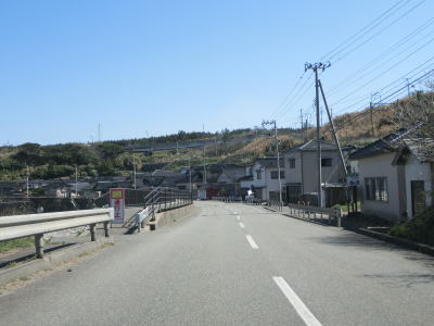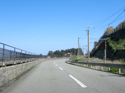 | 観音寺交差点からも2車線道路が続いているが、旧八幡町の市街地から離れるため進むにつれて周辺の家屋の数が減っていく。右、左とやや急なカーブをを曲がった後に右にカーブしながら緩やかな勾配を上って鳥海橋を渡る。その下を流れている日向川は市町境の川であり、橋を渡る事で遊佐町に入る。 | ||