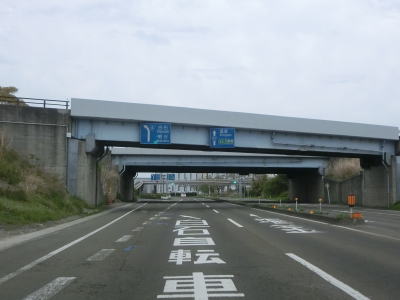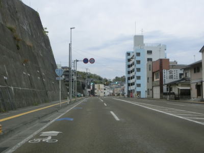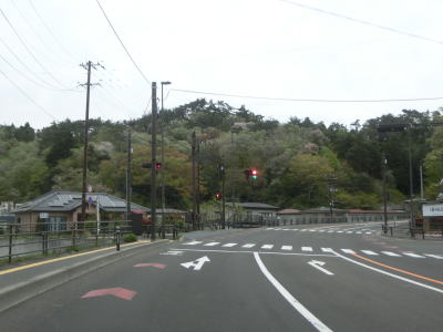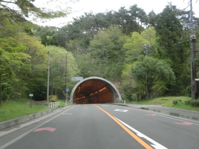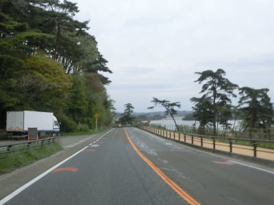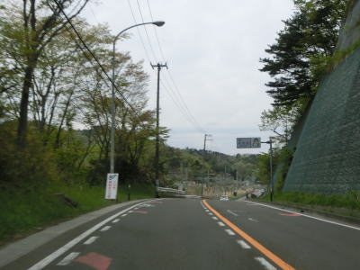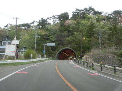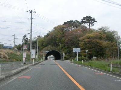 | R45/E45三陸道の松島海岸ICに至る町道との交差点を右にカーブしながら通過して緩やかな勾配を上ると浜田トンネルをくぐる。ここも海岸線に近い場所を通っているが、海面とは結構な高低差がある。過去の津波浸水区間が終わると同時に松島町に入る。 | ||