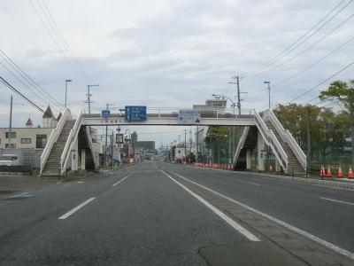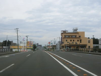 | 多賀城停車場線の宮城r143交差点を通過して多賀城橋で砂押川を渡る。JR仙石線に沿って走っていると多賀城中学校の前で「過去の津波浸水区間 R45ここまで」という標識が付けられて歩道橋を通過する。“過去の津波”とは2011年の東日本大震災の津波を指す事は言うまでもない。仙石線と少し離れた所で宮城r58下馬交差点を通過するが、ここで左側車線が左折専用車線となり、交差点以降は対面2車線になる。 | ||