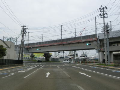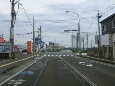 | 海岸通り交差点からも4車線道路であり、直後に宮城r3交差点を通過する。やや急な右カーブを曲がった先で市道との十字形状の交差点に至る。ここで右から交差してくる道路が港町交差点で近道とされていた市道である。R346(実質R45)は交差点を直進なのだが左にカーブしており単純な直進ではない。交差点の上の高架はJR仙石線である。 | ||