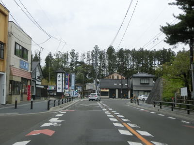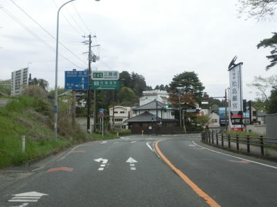 | 松島トンネルを出てすぐに宮城r144交差点を右にカーブしながら通過する。すぐ傍にJR仙石線の松島海岸駅があり、交差点に駅前ロータリーが隣接している。r144を西に進めばR45/E45三陸道の松島海岸ICに至る。 松島町の中心部は観光地らしく旅館や土産物店が多い。その中ほどで右の直角カーブを曲がり、すぐ先で左の急カーブを曲がる。五大堂を通り過ぎると左にカーブして海から離れて内陸へ進む。 |