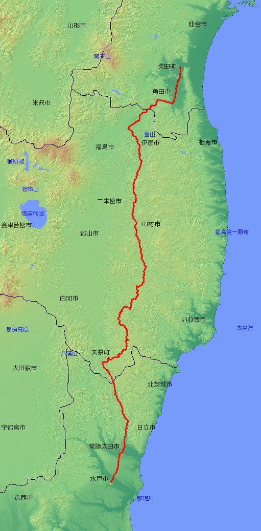| 主な経由地 | 茨城県水戸市〜常陸太田市〜 〜福島県矢祭町〜鮫川村〜いわき市〜田村市〜二本松市〜川俣町〜伊達市〜 〜宮城県丸森町〜角田市〜柴田町 |