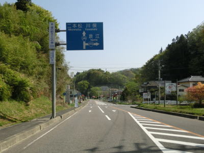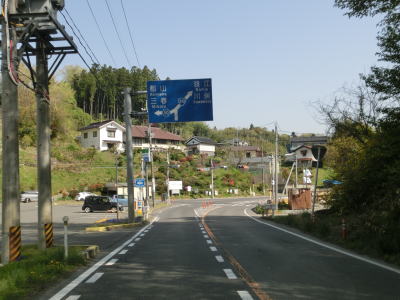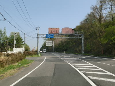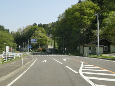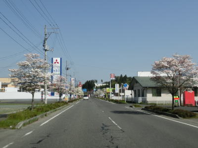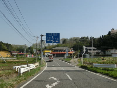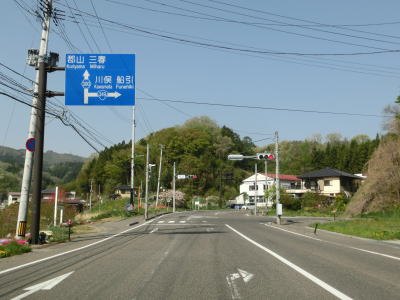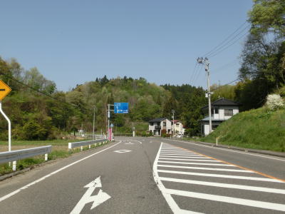 | 二本松市に入ってから約3.2kmでR459古谷交差点を通過する。案内標識には表記されていないが、ここから北はR459が重複している。古谷交差点を過ぎてすぐに道の駅「さくらの郷」を通過する。名称の由来になった合戦場のしだれ桜は道の駅より1.2km程離れている。 古谷交差点から約800m走ると大久保交差点を右折してR459が分岐する。案内標識は設置されているもののR459も2車線道路なので見逃すと直進してしまう可能性がある。前述の合戦場のしだれ桜は大久保交差点を直進した先にある。 |