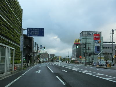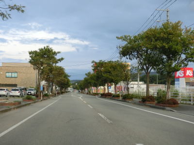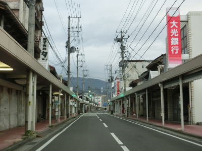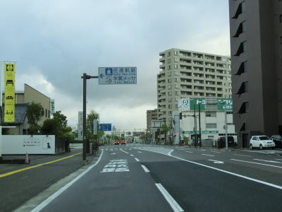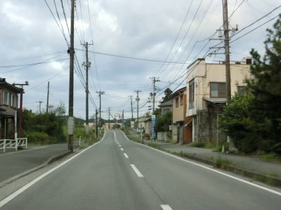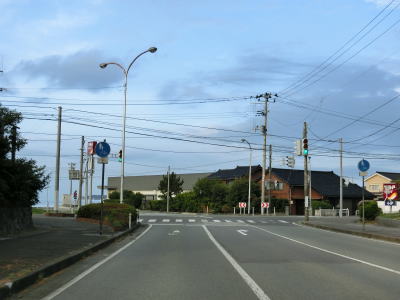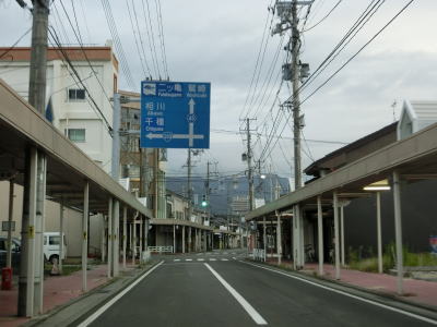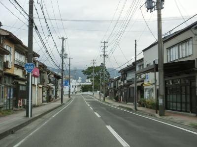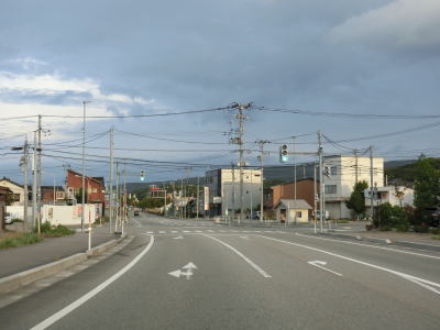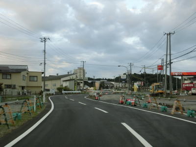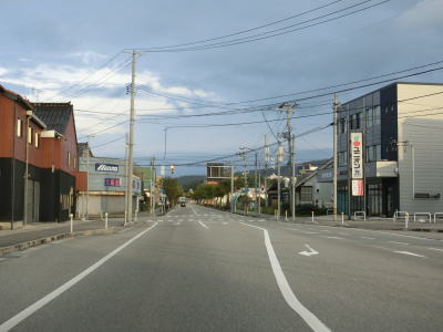 | 夷二ノ町からはアーケード街でなくなり普通の対面2車線道路を走る。旧両津市の中心部から離れていくため徐々に沿線の建物が少なくなる。小規模ながらショッピングモールのある場所の近くでは道路改良工事が行われていた。場所が場所だけに多車線化工事ではなく車線幅の拡幅や歩道の設置を行う工事と思われる。 | ||