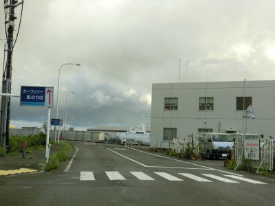 | 市街方面と分岐して一旦停止した後は対面通行になり、左カーブを曲がってジェットフォイルの乗下船用の橋の下を左折してフェリー乗船用車両置場に入る。対向車線はフェリーから下船した車両が通るルートである。 | ||