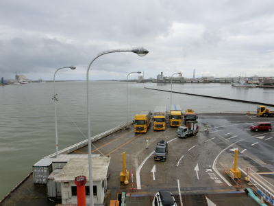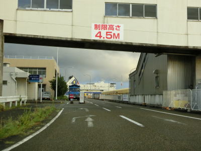 | 臨港道路万代島埠頭1号線に入ってすぐにR7万代島バイパスの柳都大橋の下をくぐる。片側2車線のうち、佐渡航路は右側車線と標示されているが、朱鷺メッセの正面玄関を過ぎるとフェリー車乗場は左側車線に標示される。最初から左側車線を走れば無駄な車線変更はしなくて済む。 | ||