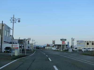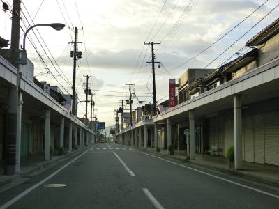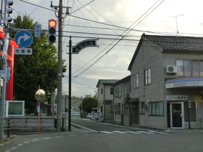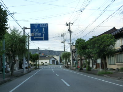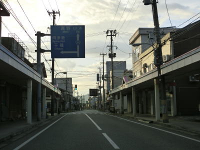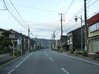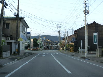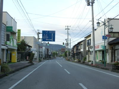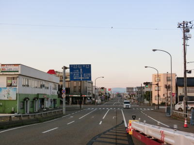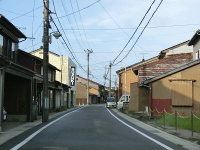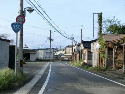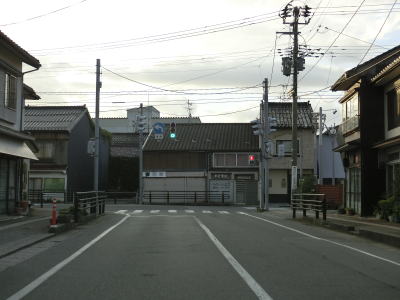 | シケインからはアーケード街を走り、程なくして市道との本町交差点を通過する。ここを左折すると佐渡高校入口交差点に至る。なお、案内標識には右折方向の道路が表記されていないが、十字形状の交差点であり右折した先に海岸線に沿った市道と交差している。 本町交差点からはアーケード街は終わるが家屋が建ち並んでいるという状況は変わらない。石田橋を渡って少し走ると広域農道(?)との八幡新町交差点を通過する。この広域農道(?)のR350をショートカットしている道路のひとつである。 |