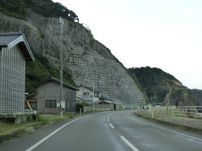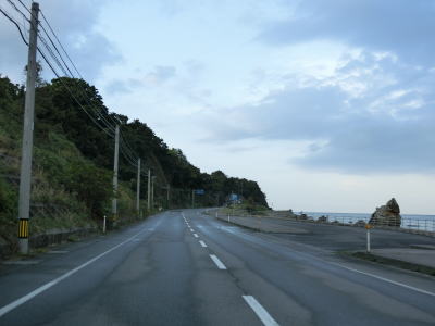 | 豊田集落を通り過ぎると海岸線沿いを走る。カーブが多少あるものの勾配は緩やかで非常に走りやすい。人面岩とも呼ばれる立岩の傍には駐車場が設置されており容易に訪れる事ができる。 | ||