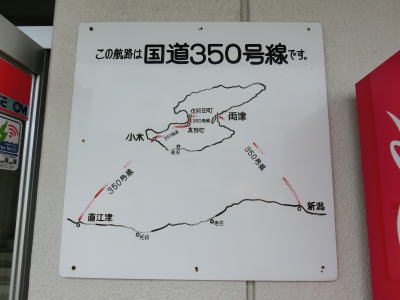 | 直江津港に到着して下船してからは港内道路を道なりに進み、港町1交差点からは新潟r468を走って緩やかなS字カーブの先の交差点がR350の直江津港側の端点である。左折方向は佐渡航路と案内されており、フェリーに乗船する車両の入口かつ駐車場の出入口でもある。 | ||
