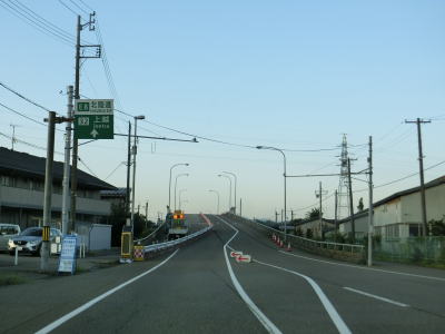 | JR信越本線の上に架けられている有田跨線橋は南向き車線側の舗装工事が行われており、北向き車線と路肩で上下線の通行が確保されていた。規制のテーパー部がガードレールとH鋼という組合せである事からある程度長い工期と思われる(9月16日には終わっていた)。有田跨線橋の北端で工事規制が終わって4車線道路に戻った直後に新潟r488春日新田交差点を通過する。 | ||