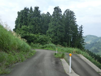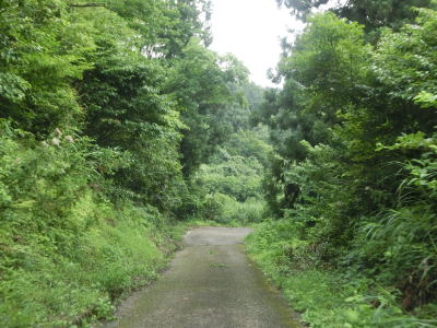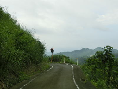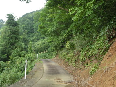 | 1.0車線幅の断崖路を走る。ワイヤロープが設置されていたのは端点付近のみでその他はデリニエータしか設置されておらず転落防止柵としては機能していない。視界が開けている場所も意外に多く、谷の向こう側に迂回路として通ってきた道路が見える。草刈りが行われているので需要が皆無ではなさそうだが、普段の交通量はほとんどないようで道路を横切るように蜘蛛の巣が張っている場所もある。バイクや自転車だと蜘蛛の巣に引っかかるのが鬱陶しいかもしれない。 | ||