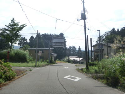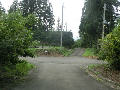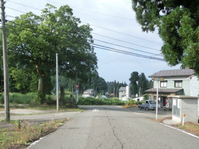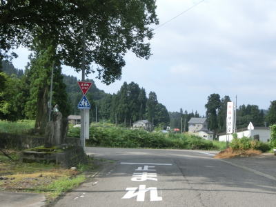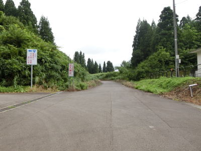 | 端点から約2.3kmで谷に下りる道路との交差点を通過し、直後に左直角カーブを曲がる。そこからは1.8車線幅と広くなった道路を下って十字路に至る。この十字路は2012年10月の時点で端点だった場所である。案内標識は設置されていないが、右折がR352魚沼方面で左折が萱峠バイパス方面である。 | ||
