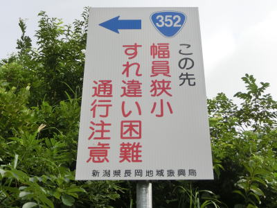 | 十字路から萱峠バイパス方面を撮影すると舗装された道路が続いているものの関係者以外立入禁止の看板が設置されている。その看板の左側に国道の管理者である長岡地域振興局が設置された看板があり、そこにはR352のおにぎりとともに「この先 幅員狭小 すれ違い困難 通行注意」と書かれている。2012年10月にはなかったもので、端点が変更になった証拠でもある。内容に目を向けると幅員狭小は正しいが、すれ違いは困難というより不可能で通行注意という生易しいものではない。こんな所まで国道色に塗ったのは誰だよ!と叫びたくなるような道路状況である。萱峠を越えられる訳でもないこの区間をわざわざ警告する必要はあるのか甚だ疑問である。 | ||