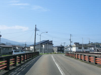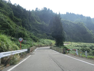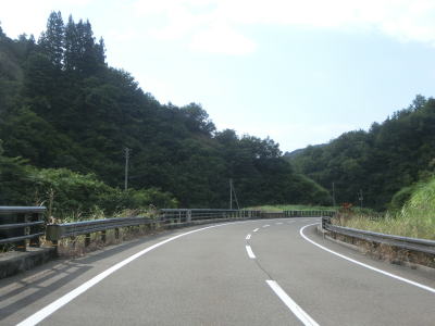 | 新潟r24との交差点からはセンターライン付きの2車線道路になる。平坦ではないものの非常に緩やかな勾配なので走りにくさは一切感じない。連続する急カーブを曲がった先で城山橋を渡るが、その前後はセンターラインがなく橋上に14tの重量制限がある。その後は改良された2車線道路に戻り、蛇行する和田川を5つの橋で渡る。 | ||
