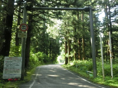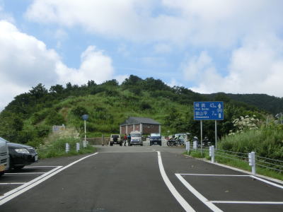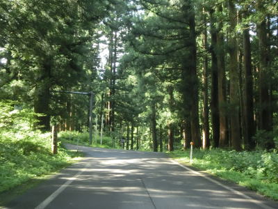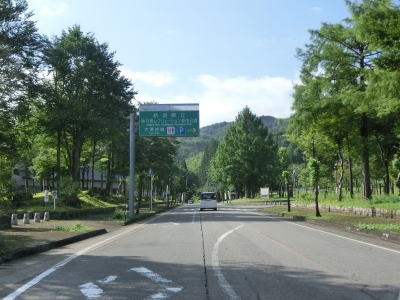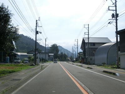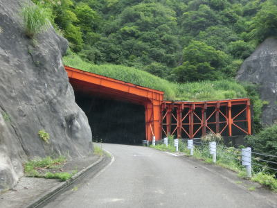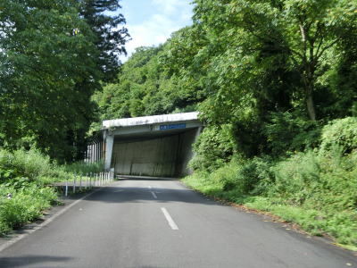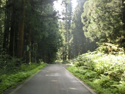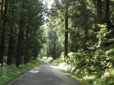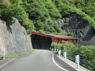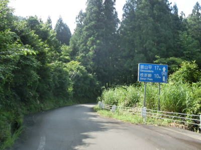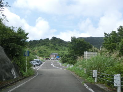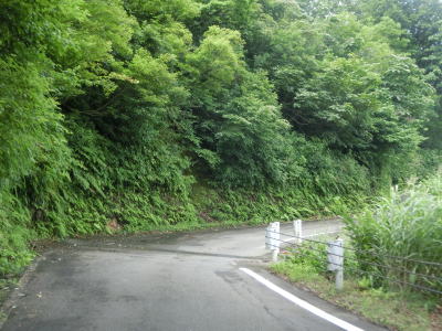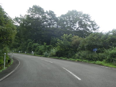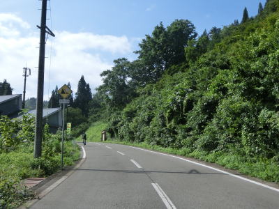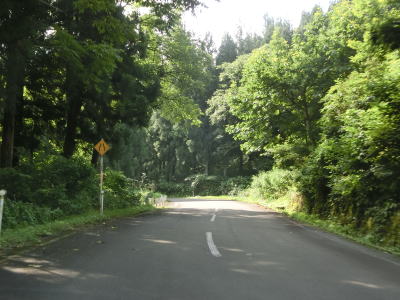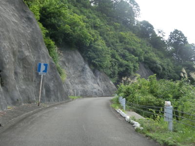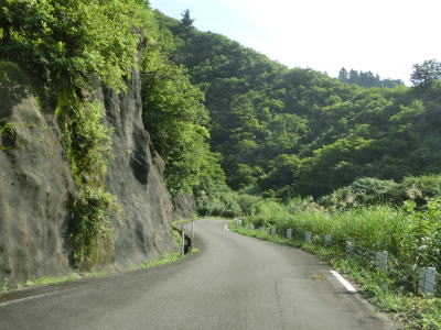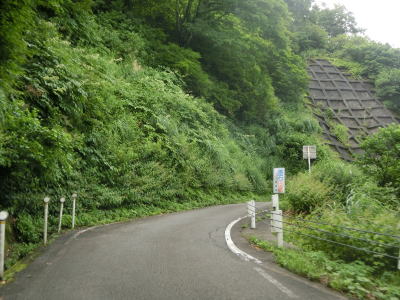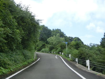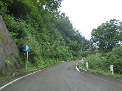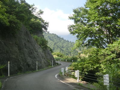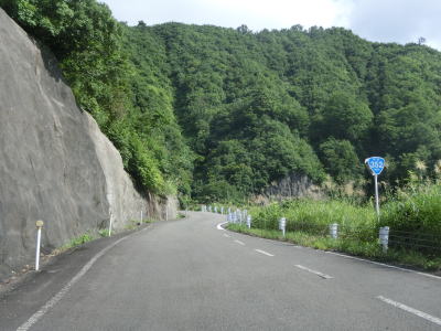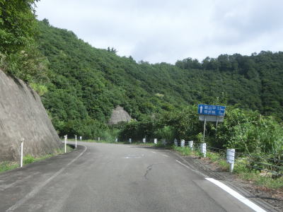 | 小刻みなカーブが連続する狭路をひたすら走る。お盆休み中の良く晴れた日だったが、交通量は少なく車よりも自転車の方が多かった。所々に待避所が設置されているが、乗用車同士であれば待避所以外でも離合できなくはない。待避所を利用するのは路線バスやマイクロバスと遭遇した時くらいだろうか。 | ||