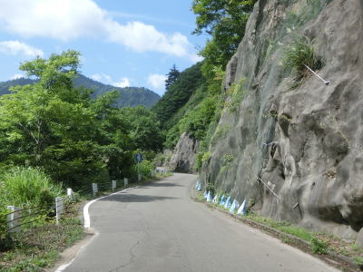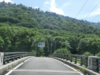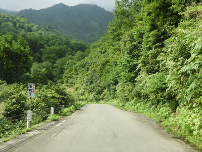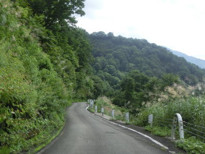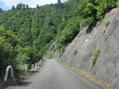 | グミ沢トンネル以降も奥只見湖沿いの狭路が続いており、勾配はほとんどないもののカーブと路上河川が多い。路上河川は4輪車であればよほど車高を落としていなければ減速すれば難なく通過できるが、2輪車は滑って転倒する可能性があるので気を遣わなければならないと思われる。神峰からも奥只見湖畔を走るが、細かく言うと中ノ岐川沿いという事になる。 | ||