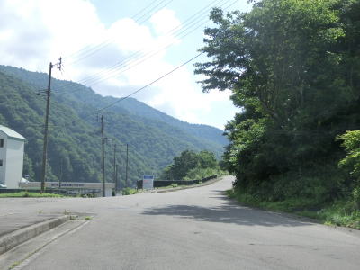 | 携帯電話の通過可能区間を過ぎてからも道路状況と風景に変化はない。県境の只見川の西を走っていると十二山神社の前で右の急カーブを曲がる。カーブの手前には車3台分の駐車場が設置されている。 その後もカーブの多い狭路を走っていると奥只見湖遊覧船の尾瀬口船着場の近くを通る。尾瀬口バス停があり道路と船着場は100段以上の階段を上り下りしなければならない。尾瀬口船着場からはカーブが少なくなり開けた谷筋を走るようになる。雪国に見られる倉庫のような建物の前を通るが、その横には公衆トイレが設置されている。 |