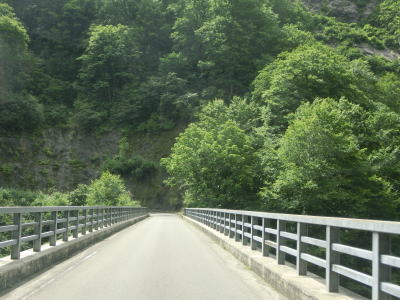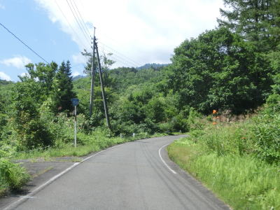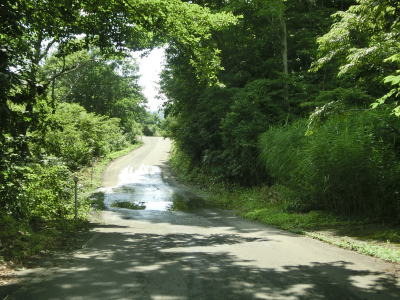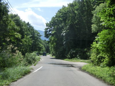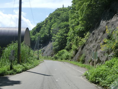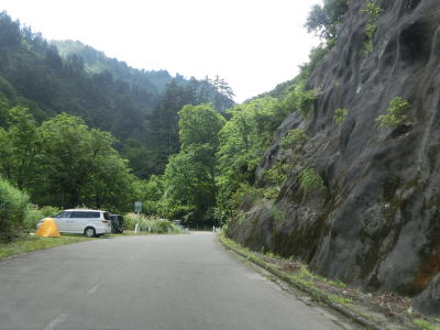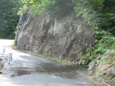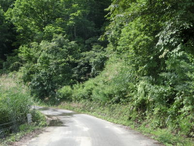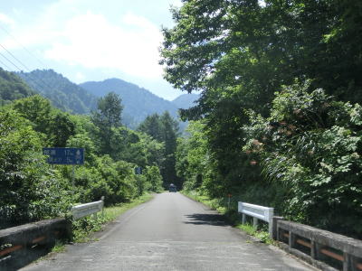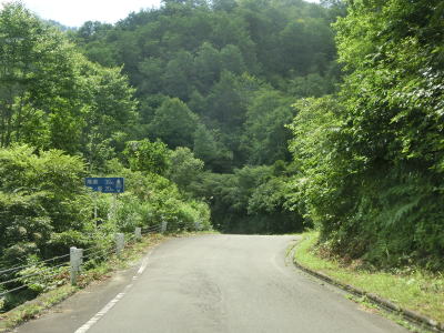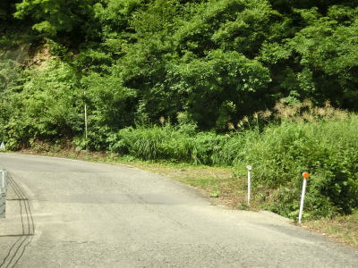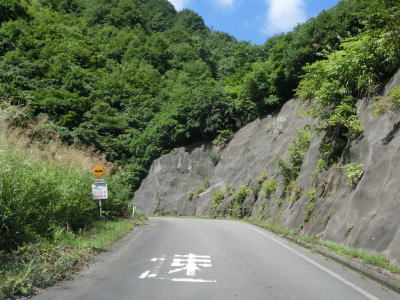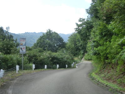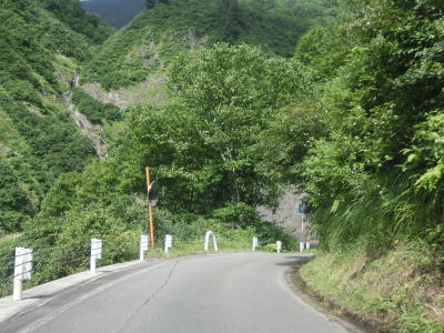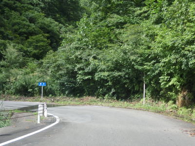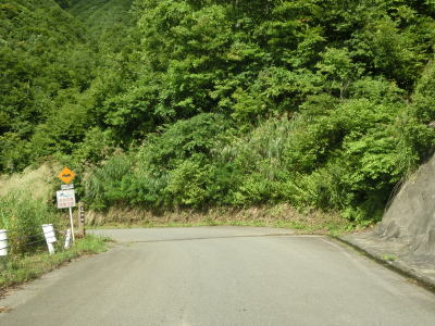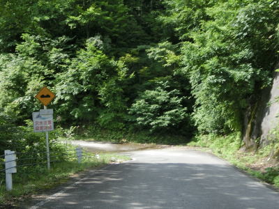 | 中ノ岐川沿いになると携帯電話が圏外になる。走行しながら確かめた訳ではないが、ここに来るまでに既に圏外になっている可能性も高い。また、樹木があるためそうは見えないが、大雨時は路面に雨水が流れる事もあるようである。その場合は当然ながら沢の水が流れる路上河川の水量も多くなるだろう。 | ||