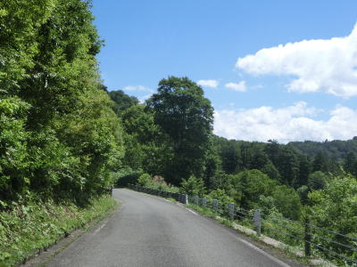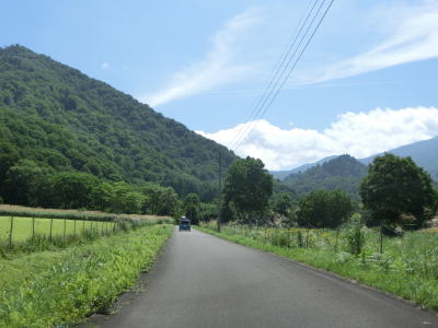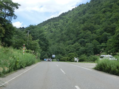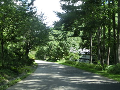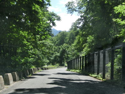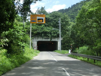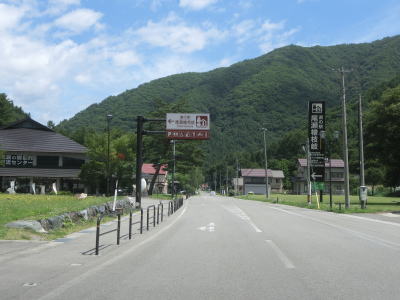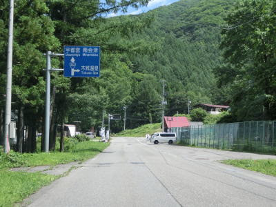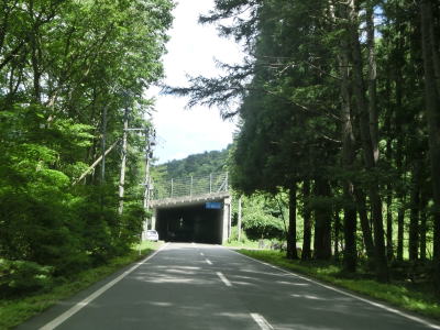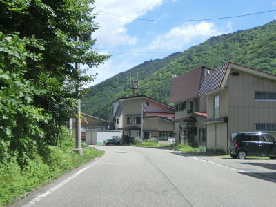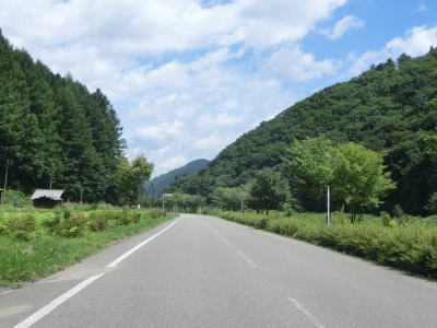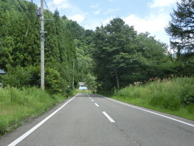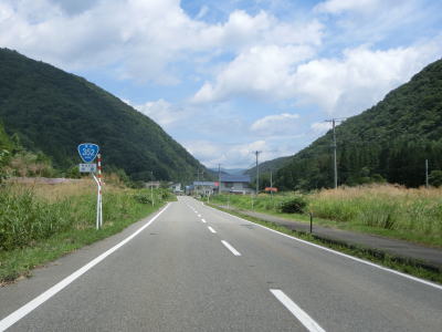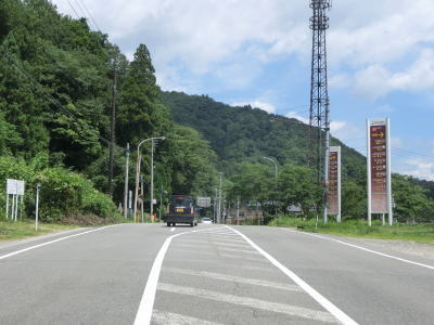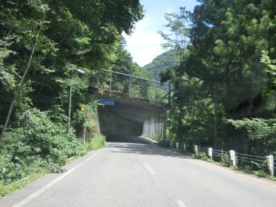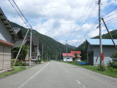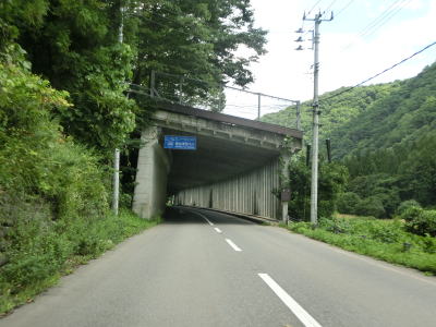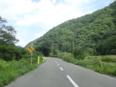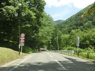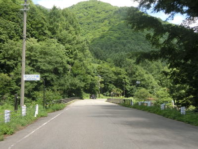 | 2つの小豆温泉スノーシェッドをくぐってからも伊南川沿いの快走路が続いている。尾瀬という一大観光地の北の出入口に至るルートで、しかも行楽日和の夏休み期間中という状況にもかかわらず交通量は少ない。駒ヶ岳スノーシェッドをくぐって少し走ると村上橋を渡って右岸に移るが、その前後にカーブがあり手前のものはかなり急である。村上橋を渡り終えると大桃集落を通り抜ける。小さな集落ながら民宿が多い。 | ||