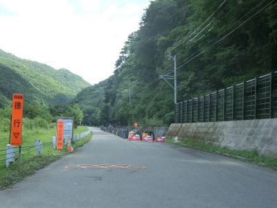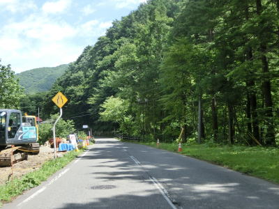 | キリンテ橋で伊南川を渡って左岸に移ると消えかけているとは言えセンターライン付きの2車線道路になる。勾配もカーブもなく非常に走りやすい道路状況だが、湯出ノ沢付近でロックシェッドが建設中で片側交互通行規制が敷かれていた。 | ||