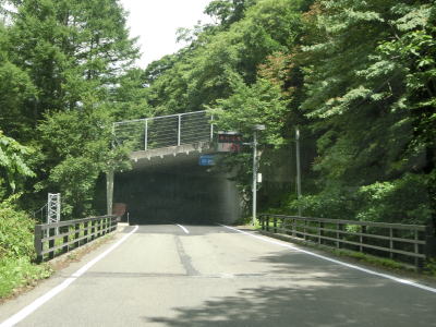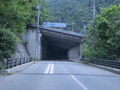 | 道の駅を過ぎてすぐに尾瀬・小繋ラインという大規模林道との交差点を通過する。この林道は町村境を越えており唐沢峠や福島r350を経由してR352に行く事も可能である。ショートカットできそうな感じだがカーブが多いため距離はほとんど変わらない。 林道との交差点の直後に追分スノーシェッドをくぐり、次いで鳴滝スノーシェッドをくぐる。前者は200mに満たないが、後者は1.4km程度とかなり長く内部に急カーブがある。 |