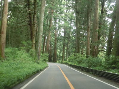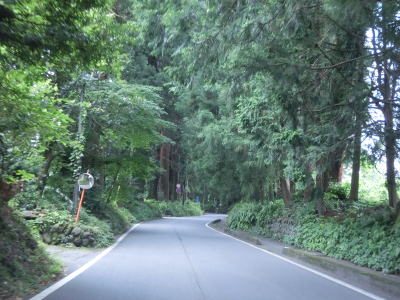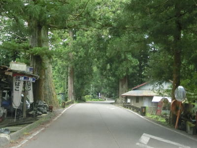 | 上板橋集落を通り過ぎると再び杉並木の中を走るが、これまでの区間に比べて道幅が広い。ただし杉の木がはみ出している箇所がいくつか存在しており、対向車がいれば減速する必要がある。場合によっては停止しなければならない。3.1kmほど走ると杉並木が途切れて集落に入る。 | ||