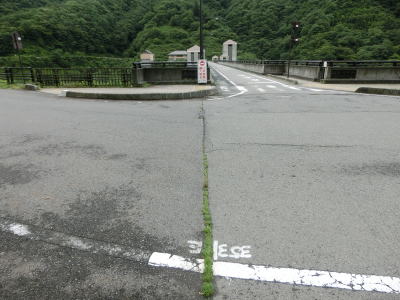 | 四万の甌穴の近くを通過するが、そこで交差している秋鹿大影林道でも分断区間を迂回する事は可能である。ただし、未舗装区間のある林道なので普通の乗用車での通行は厳しいかもしれない。幅員減少の警戒標識は立っているものの歩道や路側帯がなくなる程度で2車線道路は維持されている。 渡戸橋で四万川の左岸に移る。さらに進むと四万大橋の手前で町道が交差しているが、おそらくはR353の旧道と思われる。もっとも、国道に制定される以前に旧道になっていた可能性もある。 |