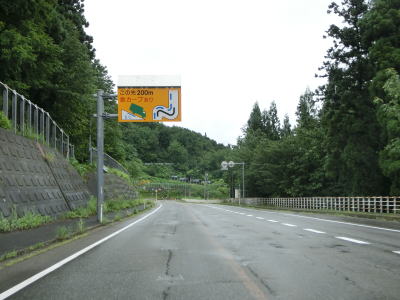 | 木沢トンネルを出てから少し走ると北向き車線に登坂車線が設置されているが、その距離は500m程度とさほど長くない。登坂車線が終わった先で芝原トンネルをくぐる。芝原トンネルからは下り勾配となり、右のヘアピンカーブを曲がる。このヘアピンカーブにも分離帯が設置されている。 | ||