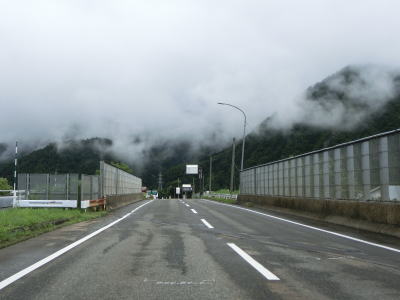 | 二居大橋を渡り終えて緩やかな勾配を上っていると二居トンネルに入る。その北にある船ヶ沢トンネルとの間にはスノーシェッドが設置されており、実質ひとつのトンネルとして機能している。次の萱付トンネルは南側にだけスノーシェッドが設置されている。萱付トンネルを出て少し走ると左、右とヘアピンカーブを通過した後に左の直角カーブを曲がる。1ヶ所目のヘアピンカーブと直角カーブの前後には車線逸脱を防ぐために分離帯が設置されている。 | ||