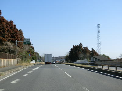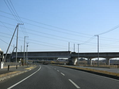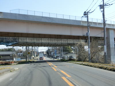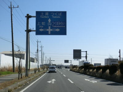 | 主に農畜関連の研究施設が集まる場所の北でR408榎戸交差点を通過する。400番台の国道ながら牛久市からつくば市にかけては片側2車線と整備されており南北を結ぶ幹線国道として機能している。 榎戸交差点を過ぎてすぐにR468/C4圏央道の館野高架橋をくぐる。この区間(つくば中央IC〜つくばJCT)も4車線化工事が行われており、東側で新たな外回り車線が工事中であった。館野高架橋をくぐって少し走ると茨城r202小野川小入口交差点を、次いで茨城r273赤塚交差点を通過する。 |