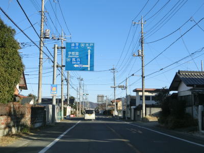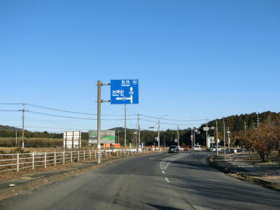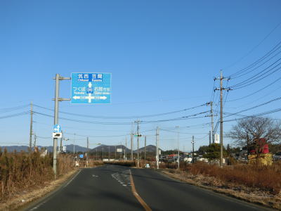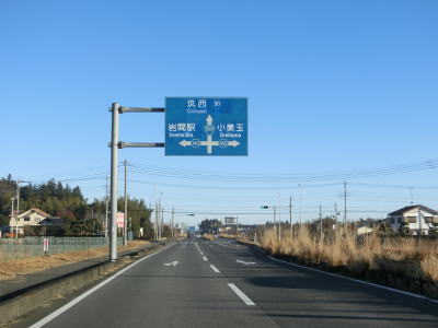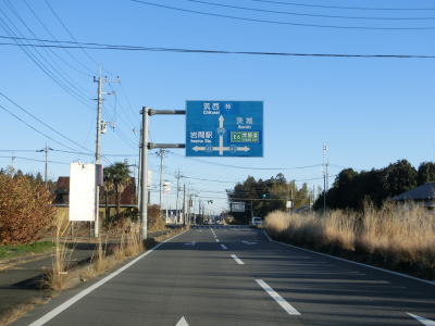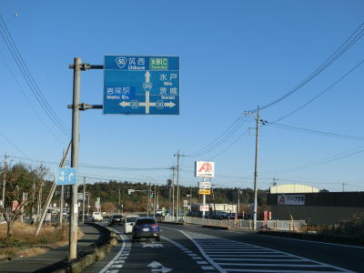 | 対面2車線道路になってからも流れの良い快走路が続いており、緩やかな左カーブの途中で茨城r30交差点を通過する。岩間駅が案内されている左折方向は旧岩間町の中心部でもあり、現道はそこを通り抜けている。大きく左にカーブしながら緩やかなアップダウンのある2車線道路を走っていると下郷跨線橋でJR常磐線の上を通る。 | ||