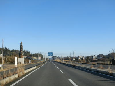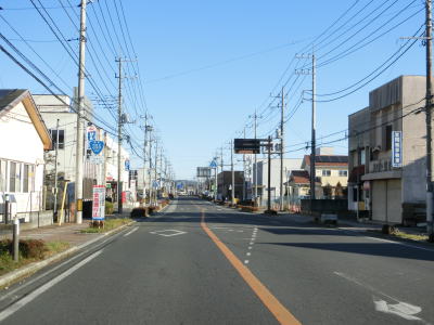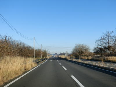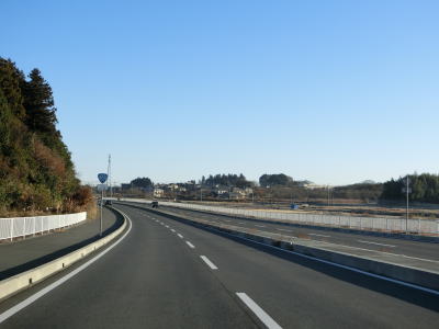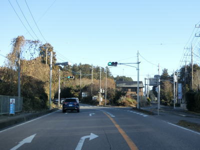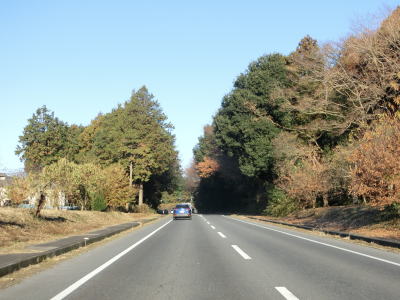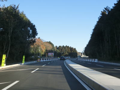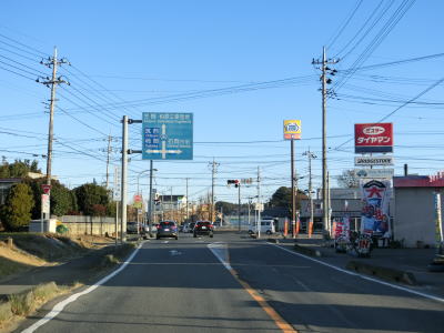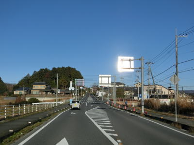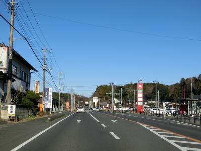 | 東成井跨線橋からの勾配を下り切って平面道路に戻った所で笠間市に入り、その直後から中央分離帯付きの片側2車線道路になる。ほぼ平坦で直線的な道路状況で沿線の建物も少ないため非常に見通しが良く走りやすい。 | ||