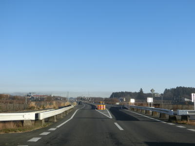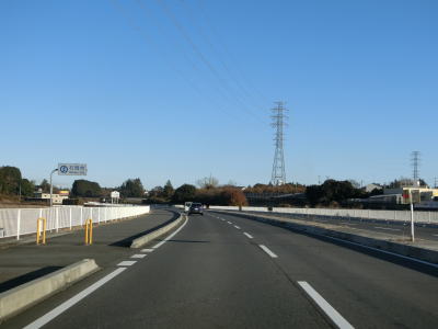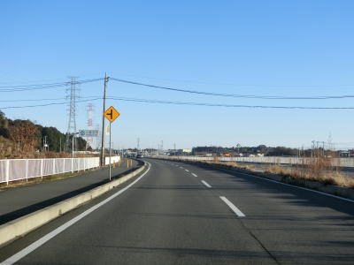 | 下り切る直前で車線が増えて片側2車線道路になって茨城r140の旧道との交差点を通過する。r140の終点はR355現道との交差点であったが、2017年にこの交差点に変更されている。既に5年以上が経過しているが、案内標識のr140のヘキサは残ったままである。また、土日休日を除く7:20〜8:00の時間帯はr140旧道への進入が禁止されている。開始時刻は7:00でも7:30でもなく7:20と中途半端な時刻が指定されている。 r140旧道との交差点を過ぎてすぐにr140交差点を通過するが、こちらが移転後の終点である。緩やかな右カーブを曲がり、緩やかなアップダウンのある片側2車線道路を走る。市街地に近い場所ではあるが若干離れているため沿線の建物は少ない。 |