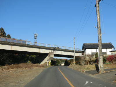 | 宍戸バイパスとの交差点を右折して現道へと進むとセンターラインのない1.8車線幅道路に変わる。前述のとおり、宍戸バイパスは全線が開通しているため、わざわざ現道に進む車は少ない。緩やかに下っているとE50北関東道をくぐる。 | ||